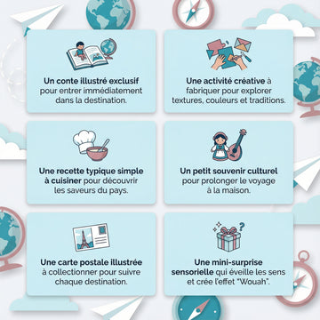 Chaque box comprend : un conte illustré, une activité manuelle, une recette, une carte collector, une carte postale, un objet typique du pays et plusieurs surprises sensorielles.